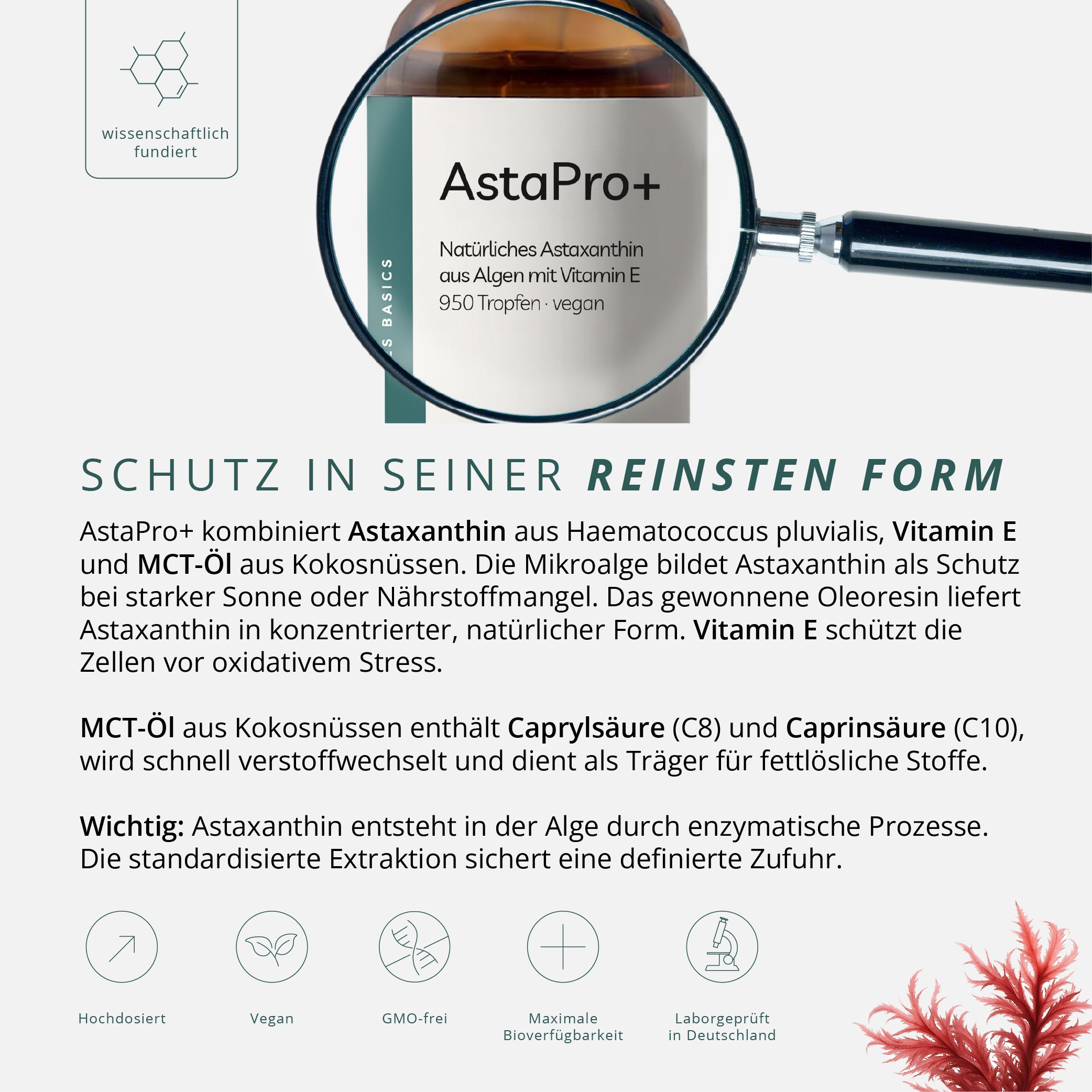 - AstaPro+ ist eine hochwertige Kombination aus natürlichen Inhaltsstoffen, die gezielt entwickelt wurde, um die Zellen vor oxidativem Stress zu schützen.