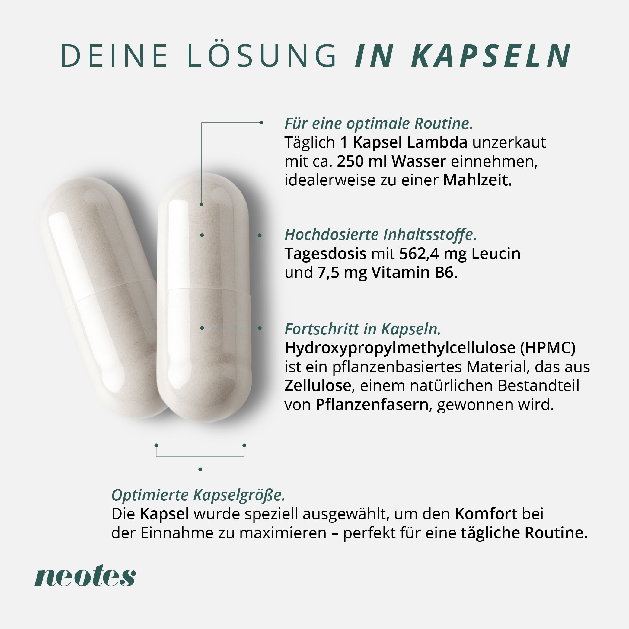 neotes Lambda kombiniert eine studienbasierte, patentierte Wirkstoffkombination aus hochdosiertem Leucin und Vitamin B6, um den Stoffwechsel anzukurbeln, Fett zu verbrennen und Muskelmasse zu erhalten.