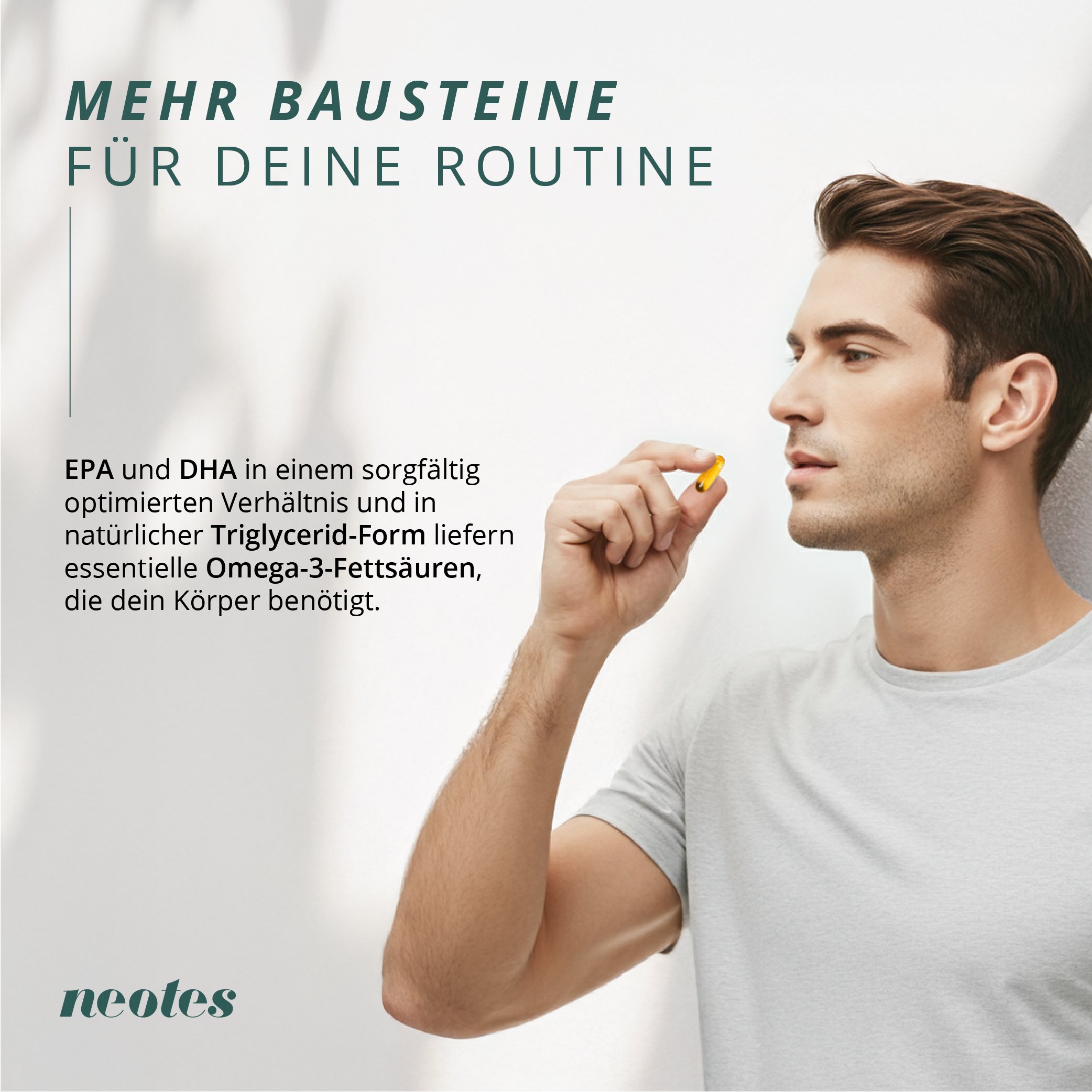 Die Tagesdosis von neotes Omega-3 ist für ein besseres Ergebnis optimiert und versorgt im Vergleich zu vielen anderen Produkten mit einem optimierten Verhältnis von DHA zu EPA.
